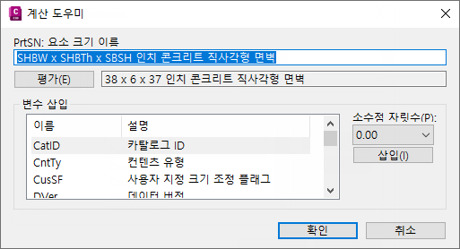매개변수 값과 연관된 계산 문자열이 표시됩니다. 예를 들어, 구조물의 요소 크기 이름(PrtSN)에 대한 계산 공식은 “SHBW x SHBTh x SBSH 인치의 콘크리트 직사각형 면벽”이 될 수 있습니다. 또는 파이프의 경우 FormatNumber($PID,0) + “ 인치 콘크리트 파이프”이 될 수 있습니다.