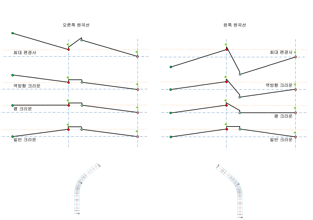 왜곡된 중앙분리대는 편경사가 적용되면 중앙분리대 폭이 동일하게 유지되지만 양쪽 측면은 편경사를 수용하기 위해 올라가거나 내려갑니다. 이 옵션은 중앙분리대 쉐이프를 왜곡하고 피벗 점은 원래 위치를 유지합니다.