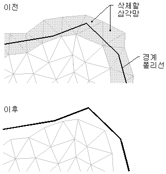 경계 모서리를 따라 비소거 브레이크라인을 사용하지 않고 경계를 작성할 경우 완전히 경계 내부 또는 외부에 있는 삼각망만 영향을 받습니다: