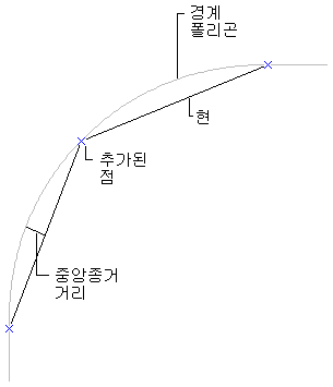 경계나 브레이크라인에 대해 원곡선이 포함된 폴리곤/폴리선을 사용하는 경우 경계 폴리곤/폴리선의 호 세그먼트를 다듬는 데 사용되는 현 세그먼트의 중앙종거 거리를 설정합니다.
