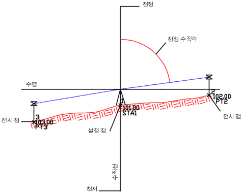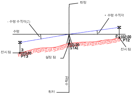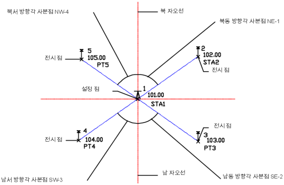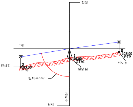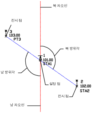 이전에 설정해 놓은 점으로서, 다른 점에 대해 방향 참조로 사용되는 점. 일반적으로 측량 기기의 이동은 0(영)도에 잠기고 수직 십자선이 후시에 설정됩니다. 아래쪽 이동이 후시에 설정되어 있는 동안에는 모든 이후 샷이 기기와 위쪽 이동을 함께 켠 상태에서 실행됩니다. 따라서 측정된 모든 각도는 후시와 관련됩니다.