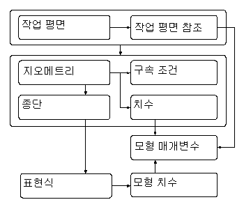 다음 그림은 모형을 구성하는 피쳐를 보여 줍니다. 화살표는 피쳐 간 관계의 방향을 나타냅니다. 예를 들어, 지오메트리를 수정하면 종단이 변경되고 종단의 변경은 표현식에 영향을 줍니다. 각 피쳐에 대해 배울 때 이 그림을 참조하면 피쳐 간 관계를 이해할 수 있습니다.