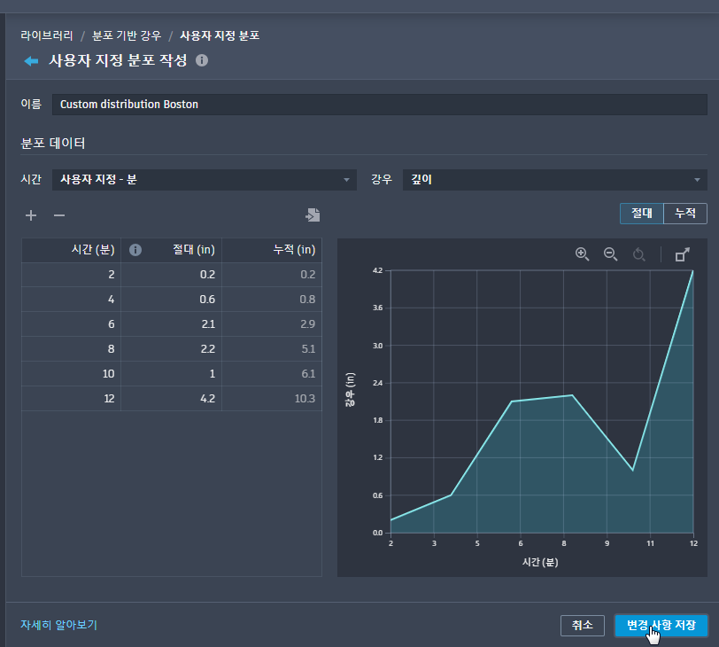 사용자 지정 분포 작성은 분포 기반 강우 이벤트에 대한 강우 분포(시간 패턴)를 정의합니다.