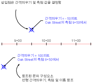 주석 레이블의 삽입점을 사용하여 위치 기반의 참조된 문자 데이터를 식별할 수 있습니다. 예를 들어, 다음 그림에서 삽입점은 레이블에 나타나는 측점 값과 간격띄우기 값을 결정합니다.