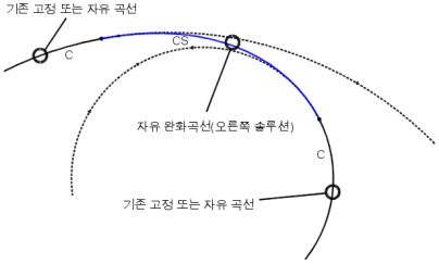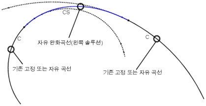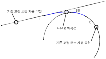 다음 그림은 직선을 먼저 선택했을 때 직선과 원곡선 사이의 자유 완화곡선을 보여 줍니다.