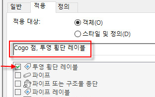 투영 레이블 스타일에 특성 세트 데이터를 포함하려면 투영이 횡단 뷰에 표시된 객체 유형 외에 투영 횡단 레이블 객체 유형을 선택해야 합니다.
