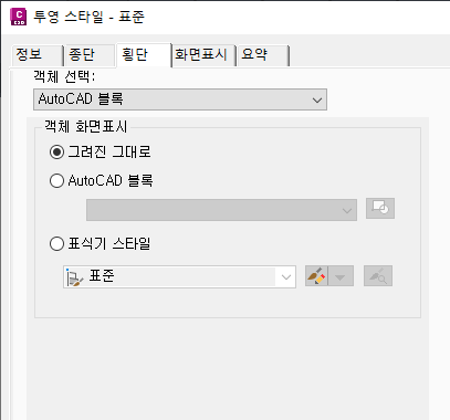 투영 스타일 집합에 있습니다. 횡단 탭에서 횡단 뷰에 대한 화면표시 설정을 구성합니다.