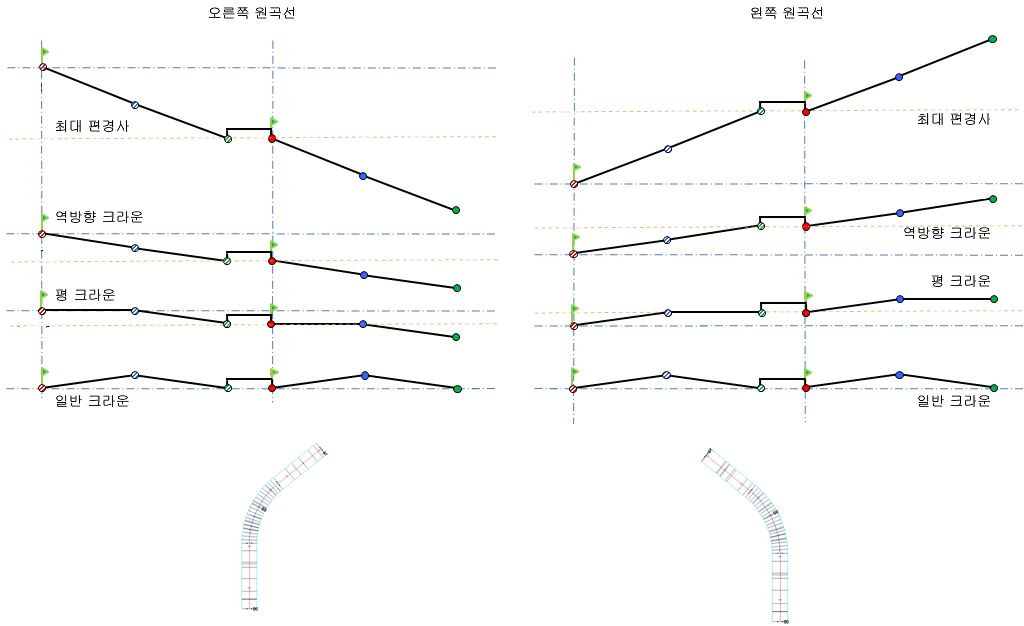 중앙분리대 쉐이프 유지는 편경사가 적용되면 편경사를 수용하기 위해 중앙분리대를 올리는 것을 의미합니다. 이 옵션은 중앙분리대 쉐이프를 유지하고 피벗 점을 올리거나 내립니다.