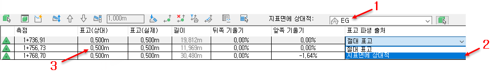 정지 표고 편집기에서 행을 클릭하면 표식기가 도면에 표시되어 현재 위치한 정점을 나타냅니다.