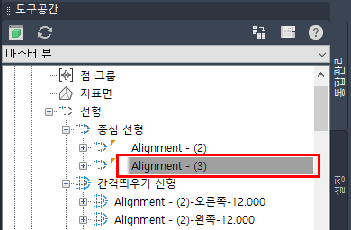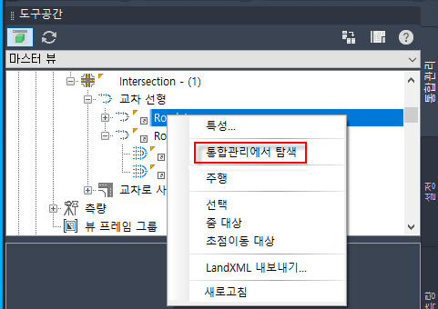 중심 선형 집합 아래에 자동으로 표시되고 선택됩니다. 이 명령을 사용하여 통합관리 트리에서 교차 선형의 위치를 신속하게 찾을 수 있습니다.