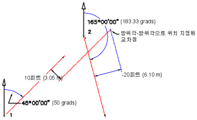 교차로는 점 1에서 오른쪽으로 간격띄우기 거리를 10으로 하여 그려진 50.000 방위각과 점 2에서 왼쪽으로 간격띄우기 거리를 20으로 하여 그려진 183.3333 방위각 사이에 배치됩니다.
