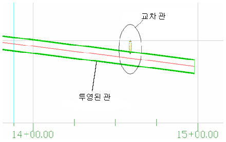 다음 그림은 횡단 뷰의 파이프 교차 및 투영된 파이프를 보여 줍니다.