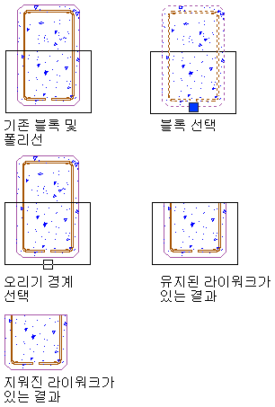 를 클릭합니다. 오리기 경계의 외부에 있는 원래 선택한 선작업의 모든 부분이 지워집니다. 자르기 경계 지우기를 선택한 경우, 자르기 영역 내부에 있는 모든 닫힌 경계의 도면요소에 대해 경계가 다시 그려지지만 잘려진 열린 경계 객체는 열린 상태로 유지됩니다.