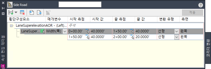 명령행 프롬프트를 사용하여 변환할 횡단구성요소 및 변환할 매개변수를 선택한 다음 측점, 값, 변환 유형을 선택합니다.