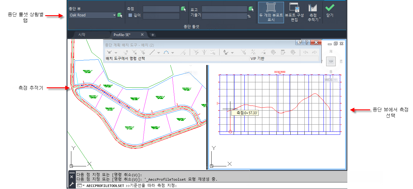 명령을 실행 중인 경우 투명 리본 탭에서 종단 툴셋 명령을 선택하면 종단 툴셋 상황별 리본 탭이 표시됩니다.