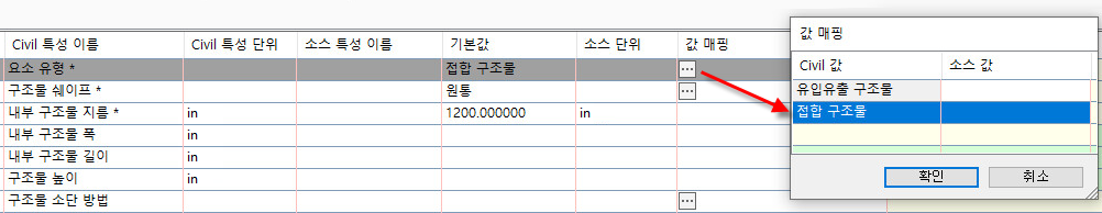 다음 예에서는 값 매핑 대화상자를 사용해 "Structure_type" 속성의 소스 값을 매핑하여 Civil 3D에 접합 구조물로 가져오는 방법을 보여줍니다.