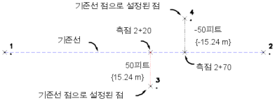 | 측점 | 지정된 점의 측점 위치. 측점을 현재 거리 단위로 입력합니다. 측점 항목의 예로는 0, 50, 100 등이 있습니다. 예를 들어, 측점 150은 측점이 기준선을 따라 150피트(또는 미터)임을 나타냅니다. |