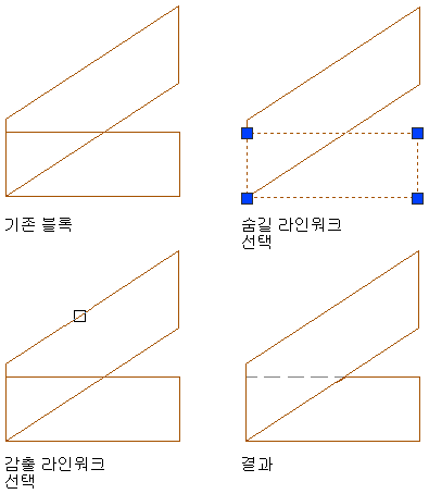 다른 라인워크를 기준으로 라인워크 영역을 감추거나 "숨기기"합니다. 이 기능은 주로 한 도면요소를 전경에 표시할 다른 도면요소의 뒤로 또는 밑으로 확장하는 것을 지시할 경우 유용합니다. 감추어진 선작업은 HIDDEN 도면층 키에 의해 지정된 도면층 위에 배치됩니다.