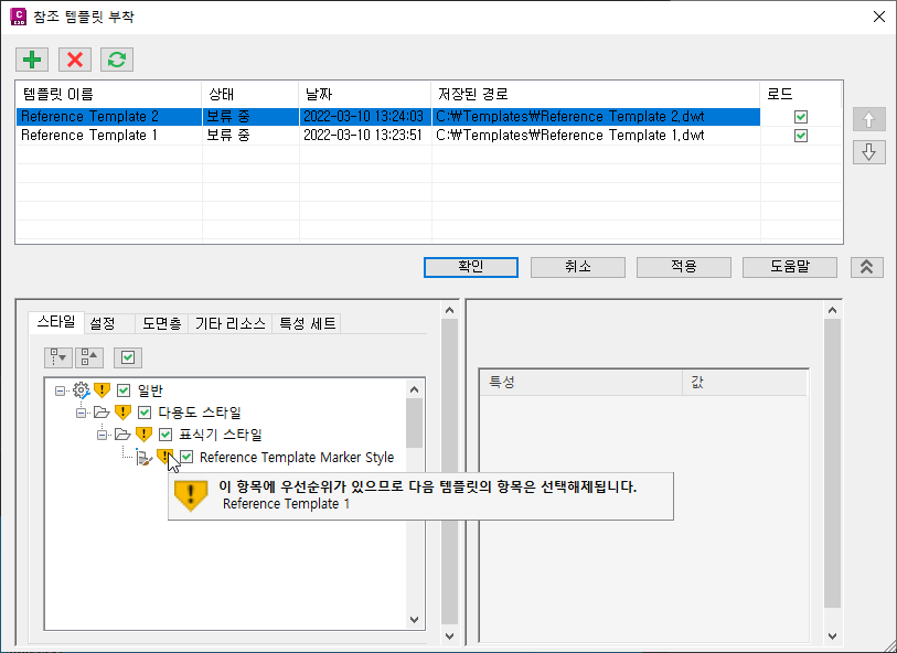 추가 참조 템플릿을 도면에 부착하는 경우 이는 우선순위가 가장 높은 템플릿으로 템플릿 리스트 상단에 추가되며, 구성요소가 다른 참조 템플릿의 구성요소와 중복되는 경우에는 경고가 표시됩니다. 중복 항목 관리에 대한 자세한 내용은