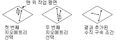 요소 작성기에서는 10가지 지오메트리 구속조건을 제공합니다. 다음 리스트에서는 구속조건과 함께 사용할 수 있는 피쳐에 대해 설명합니다.