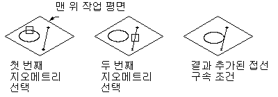 선 또는 호와 같은 원곡선 지오메트리와 다른 원곡선 지오메트리 또는 선 간에 정의할 수 있습니다. 물리적으로 한 점을 공유하지 않더라도 두 원곡선이 서로 접하도록 합니다. 접선은 선을 호 또는 원에 구속할 때 많이 사용합니다.