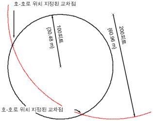 교차로는 점 1을 중심으로 반지름이 100인 호와 점 2를 중심으로 반지름이 200인 호 사이에 배치됩니다.