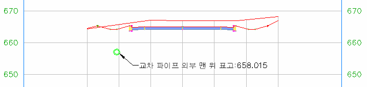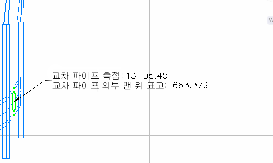 교차 파이프가 선형을 따라 다른 측점으로 이동될 경우 레이블은 새 측점 및 표고 정보로 업데이트됩니다.
