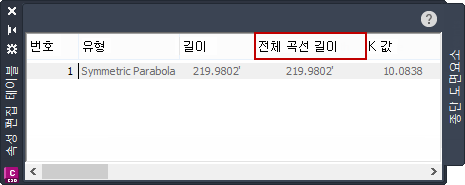 이 뷰를 사용하여 종단의 특정 하위 도면요소와 관련해서 또는 VIP에서 원곡선과 접선에 대한 숫자 데이터를 보고 편집할 수 있습니다.