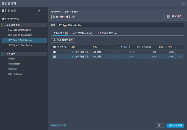 - 세트 이름을 바꾸거나 강우 이벤트를 더 추가합니다.