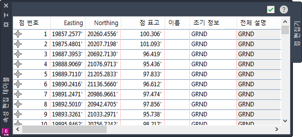 속성 편집 테이블 윈도우에 표시되는 데이터 뷰를 뷰라고 말합니다. 속성 편집 테이블 윈도우에는 점 편집기 뷰 및 선형 도면요소 뷰와 같은 여러 유형의 데이터가 표시될 수 있습니다.
