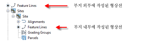 부지 외부의 형상선은 통합관리의 최상위 형상선 집합에 표시됩니다. 부지 내 형상선은 통합관리의 부지 집합 내에 나타납니다.