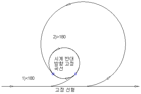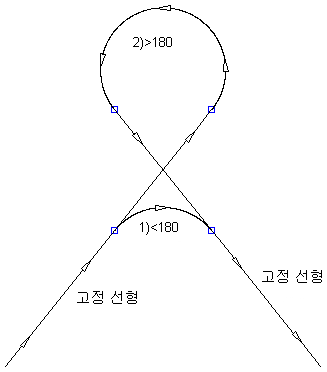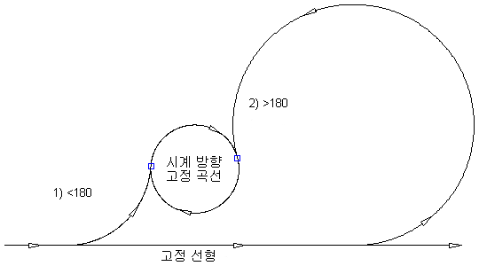 지정된 각도 범위 및 반지름을 사용하여 두 도면요소 사이에 자유 원곡선을 추가합니다.