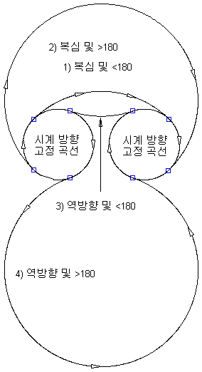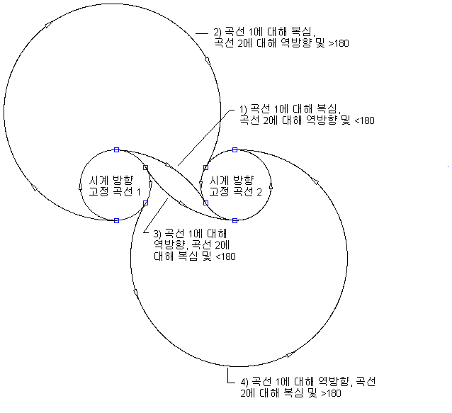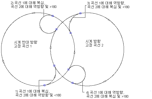 다음 그림은 시계 방향 두 고정 원곡선 사이의 자유형 원곡선 모깎기를 보여 줍니다.
