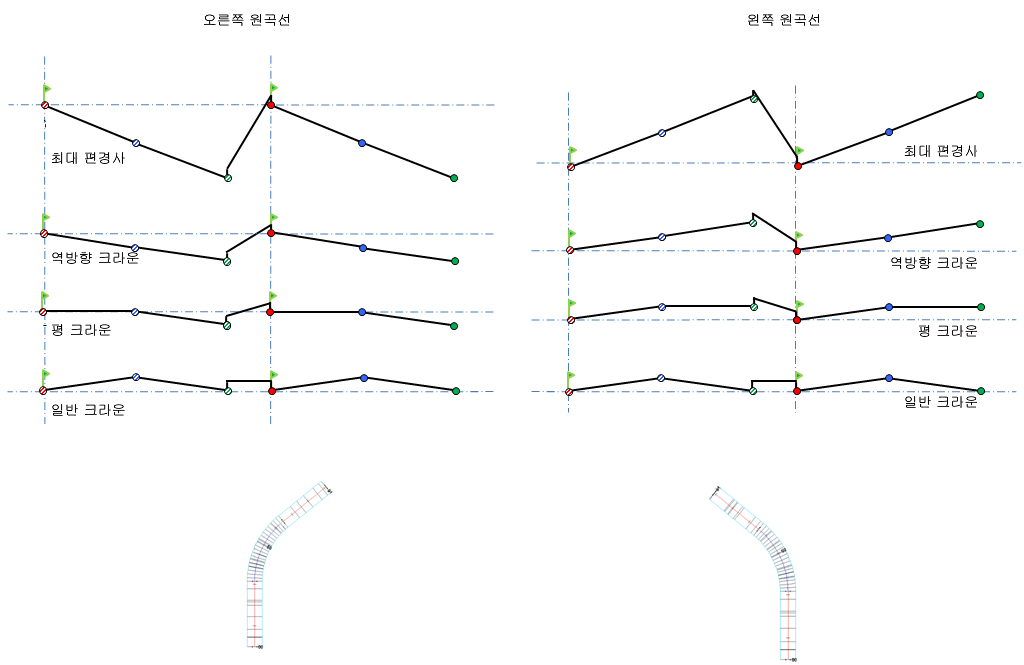 다음 그림에서는 분할된 크라운형 도로의 왼쪽 피벗 방법을 설명합니다.
