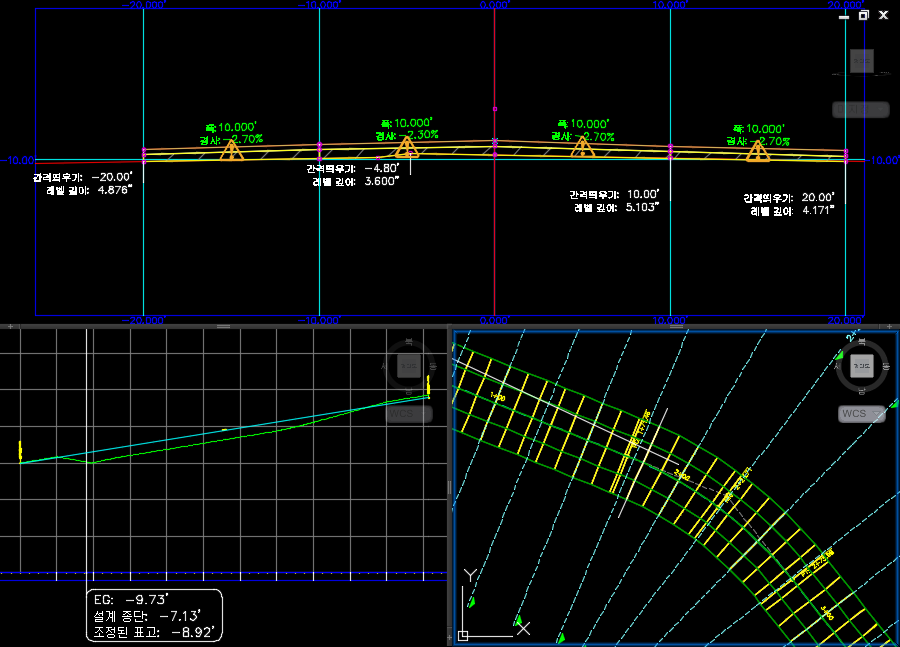 재건 코리더 내에서 재건 영역을 선택하면 측점에 대한 코리더 횡단(횡단 뷰), 횡단면에 대한 수직 종단(종단 뷰) 및 재건 코리더의 선형에 있는 코리더 횡단 위치(평면 뷰)를 볼 수 있는 세 가지 기본 뷰포트가 표시됩니다.