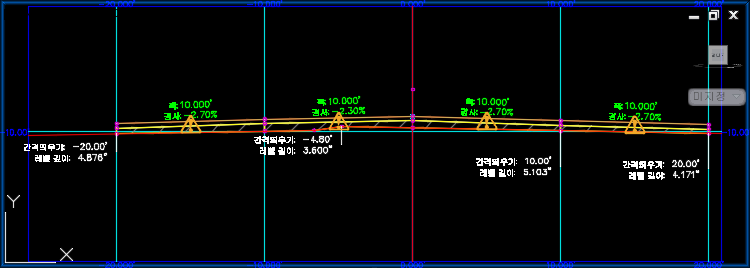 분할되지 않은 재건 코리더 횡단의 경우 조정된 표고는 선택한 측점에 대한 크라운 점 표고와 동일합니다.