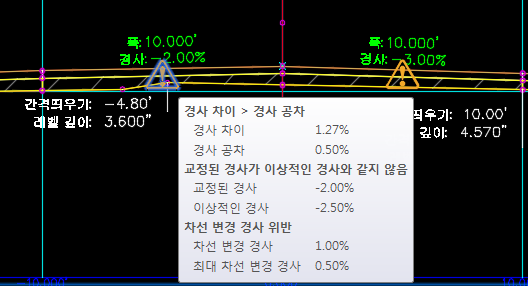 측점 간 길이의 거리를 기준으로 하여 두 측점 간에 교정된 경사의 변경사항이 최대 상대 그라데이션보다 크면 위반이 표시됩니다.