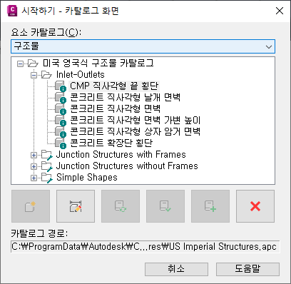 대화상자에서 파이프 카탈로그 또는 구조물 카탈로그 작업을 선택하고 해당 카탈로그 내 범주를 탐색할 수 있습니다.