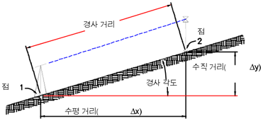 | 점 1 및 점 2 | 두 점 사이에 비가시적인 선이 설정되어 있는 기존의 두 점. 이 선은 두 점 사이의 경사 거리를 결정하는 데 사용됩니다. |
