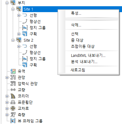 통합관리 트리에서 명명된 부지 집합 노드(예, 부지 1)를 마우스 오른쪽 버튼으로 클릭하여 이러한 특성에 액세스합니다.