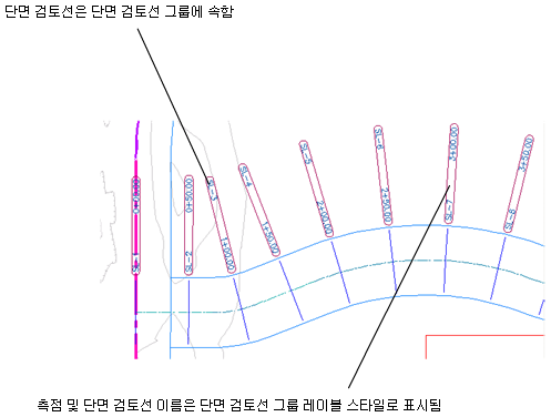 선형을 따라 단면 검토선을 만들면 지정된 기존 또는 제안된 지표면, 코리더 모형 또는 관망 세트에 대한 횡단면 객체도 작성됩니다. 각 단면 검토선의 기본 스타일 및 단면 검토선 객체는 단면 검토선 그룹을 통해 지정됩니다. 기타 단면 검토선 객체는 단면 검토선이 작성된 후에 단면 검토선 그룹에 추가할 수 있습니다. 도면에서 횡단면을 플로팅하려면 개별 횡단 뷰나 여러 횡단 뷰를 작성합니다.