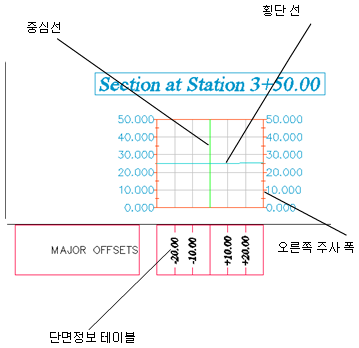 횡단 뷰는 종단 뷰와 비슷하며, 기본적으로 횡단 뷰 스타일로 제어되는 고유한 특성이 있는 그리드이거나 그래프입니다. 단면 검토선과 관련된 횡단 뷰는 도구공간의 통합관리 트리에서 해당 단면 검토선 아래에 저장됩니다. 개별 횡단 뷰는 항목 뷰를 사용하여 도구공간에서 액세스할 수 있습니다. 도면에서 단면 검토선을 삭제하면 해당 단면 검토선에 있는 횡단 뷰도 삭제됩니다.