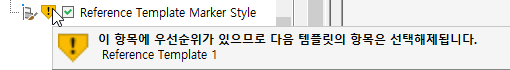 둘 이상의 템플릿을 도면에 부착한 경우, 템플릿에 중복 구성요소가 있다는 경고를 받게 되므로 이 문제를 해결할 방법을 결정할 수 있습니다. 템플릿 우선순위 순서를 변경하거나 우선순위가 더 낮은 템플릿에서 구성요소를 참조하도록 선택할 수 있습니다.