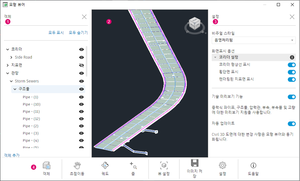 를 클릭하면 패널이 표시되거나 숨겨집니다. 자세한 내용은 Civil 3D 모형 뷰어 객체 패널을 참고하십시오.