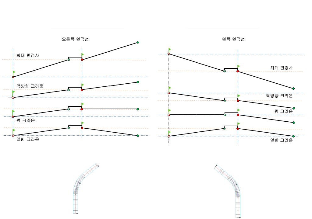 중앙분리대 쉐이프 유지는 편경사가 적용되면 편경사를 수용하기 위해 중앙분리대를 올리는 것을 의미합니다. 이 옵션은 중앙분리대 쉐이프를 유지하고 피벗 점을 올리거나 내립니다.