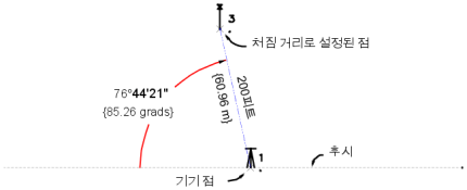 | 수직각 | 수직각의 방향(천정, 수평 또는 천저). 이 값을 현재 각도 단위(DMS, 그래드, 십진각, Mils 또는 라디안)로 입력합니다. |
