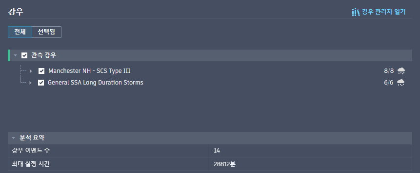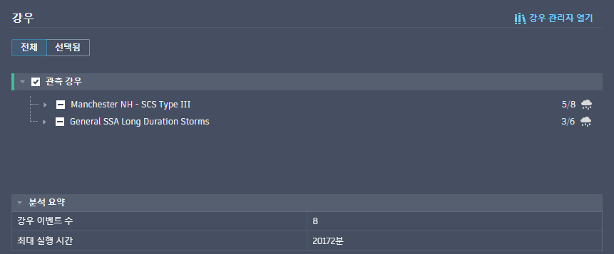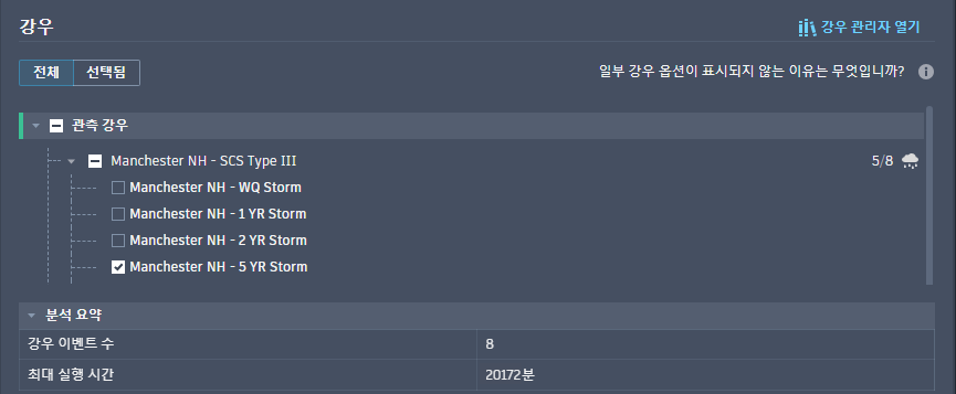 강우 세트 오른쪽에 있는 숫자는 해당 세트에서 선택된 이벤트 수와 가능한 전체 이벤트 수를 나타냅니다. 맨 아래의 분석 요약에는 배수 시스템에 적용된 총 강우 이벤트 수와 이벤트 중 가장 크게 지정된 최대 실행 시간이 표시됩니다.