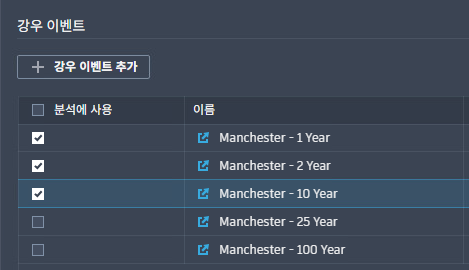 - 강우 리스트에서 원하는 강우 이벤트가 포함된 강우 세트를 선택합니다.