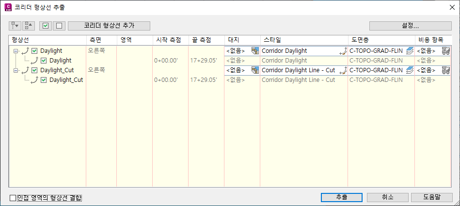 형상선 선택: 확인란을 선택하거나 선택 취소하여 추출할 형상선의 선택 항목을 변경합니다. 또한 코리더 형상선 추가를 클릭하여 추가 형상선을 선택하는 명령행 프롬프트로 돌아갈 수 있습니다.