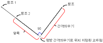 간격띄우기, 거리 그리고 두 점에 의해 정의된 무한선에 직각이 투영되는 교차로를 결정할 수 있습니다. 교차로를 찾은 후 새로운 점 식별자를 지정하여 이 교차로를 저장할 수 있습니다.